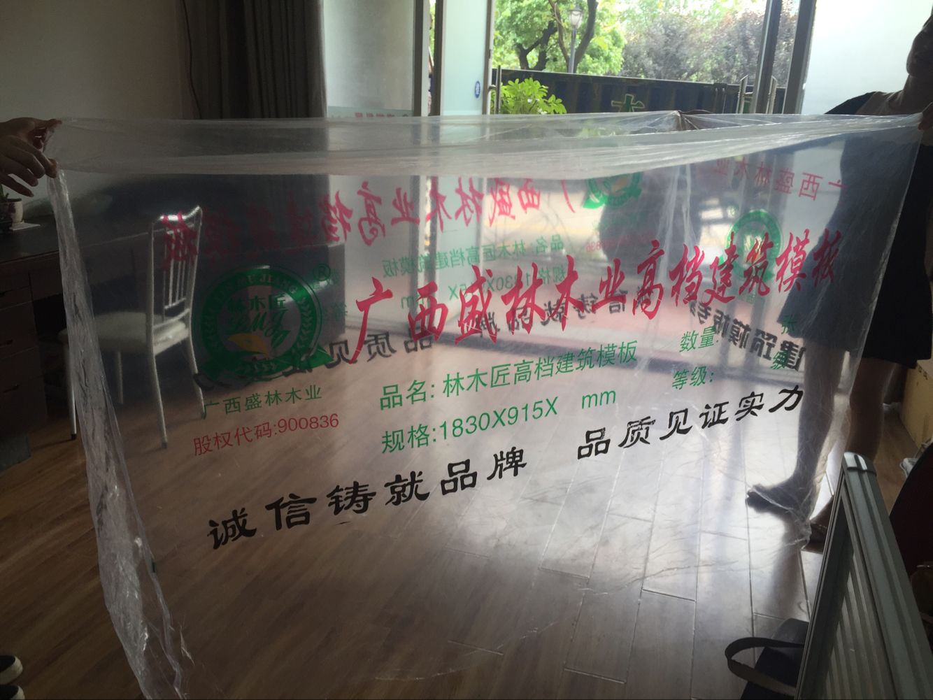 建筑模板塑料包装袋,规格是1830*915*1200mm,厚度为3丝,四面印刷。