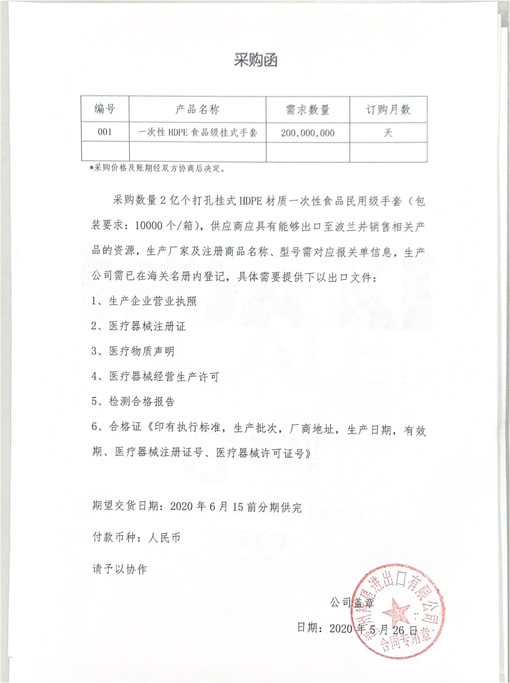 2亿个一次性PE手套 克重 少1克以上,大号,需要有出口资质和检测证书。