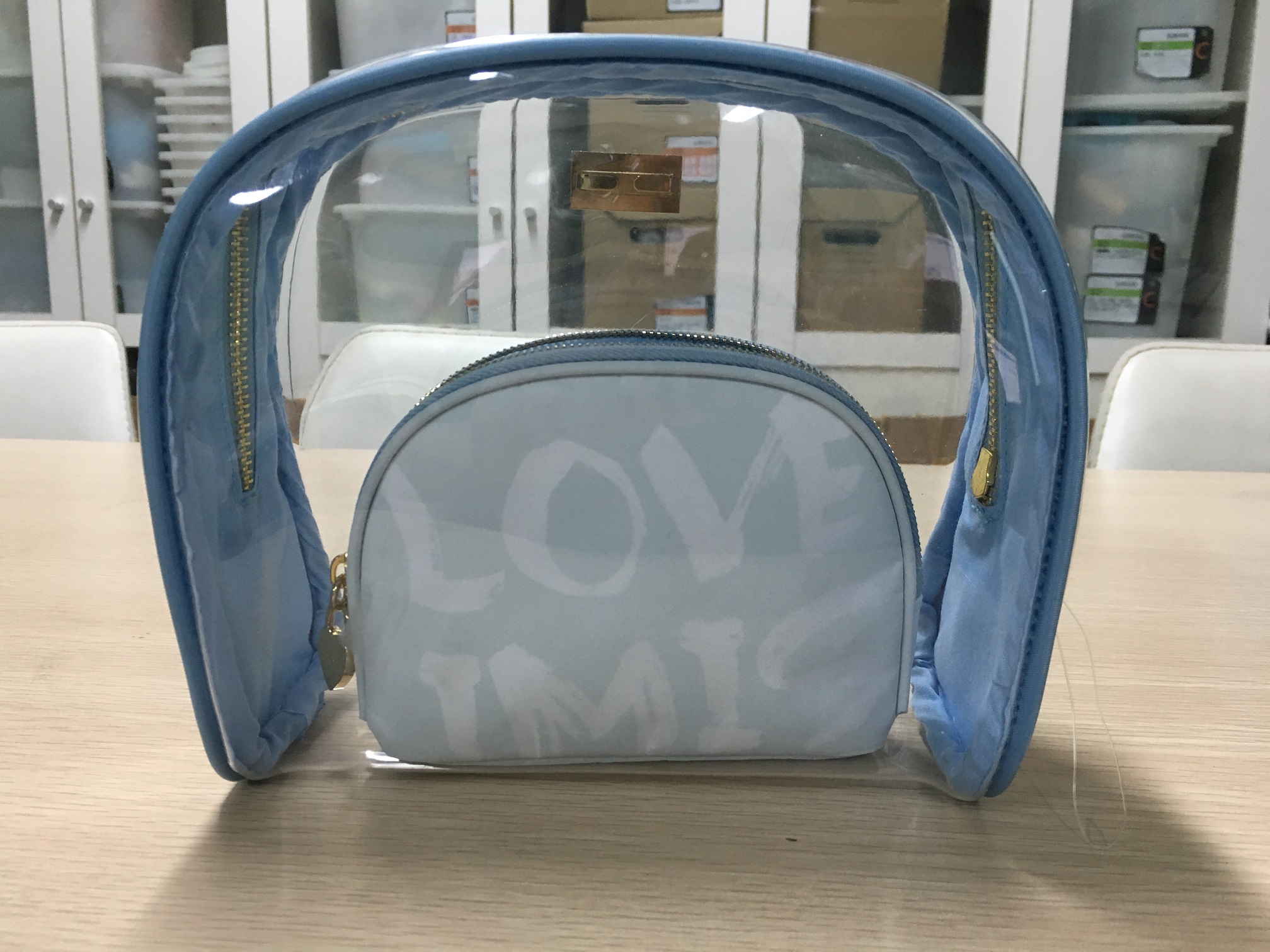 1,500套 | 蓝色/大包:底长19.5cm*底宽9cm*高18cm/透明PVC/小包:底长13.5cm*底宽5cm*高10cm/牛津布+里布+薄海绵/金色拉链齿或者树酯拉链/详见详细说明 |