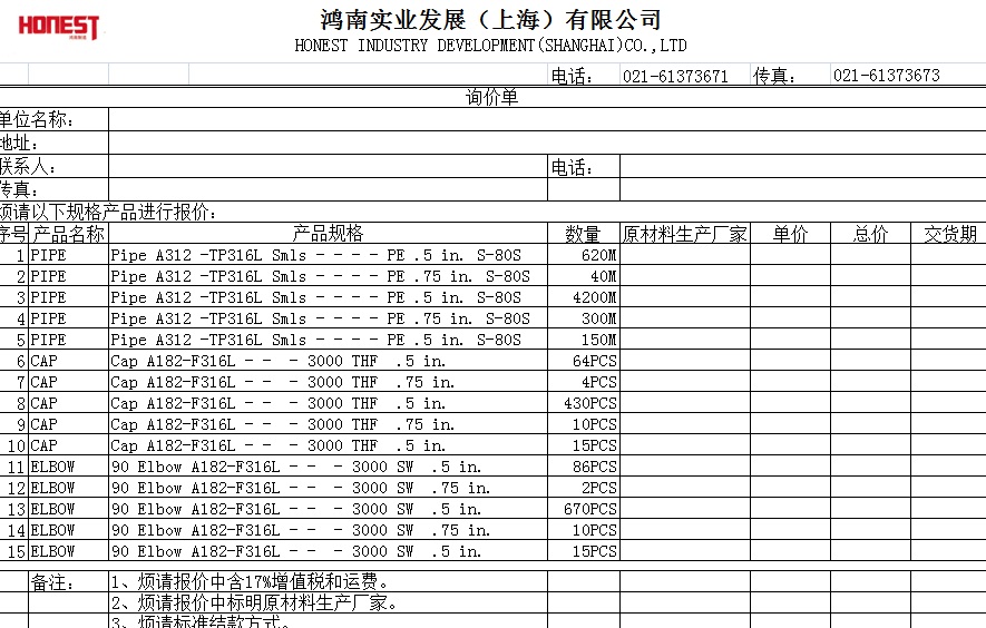 需长期采购PIPE:316不锈钢无缝管,详见附件,报含税价格,要求供应商为与化工类钢管相关的厂家, 在上海周边的,欢迎报价!
