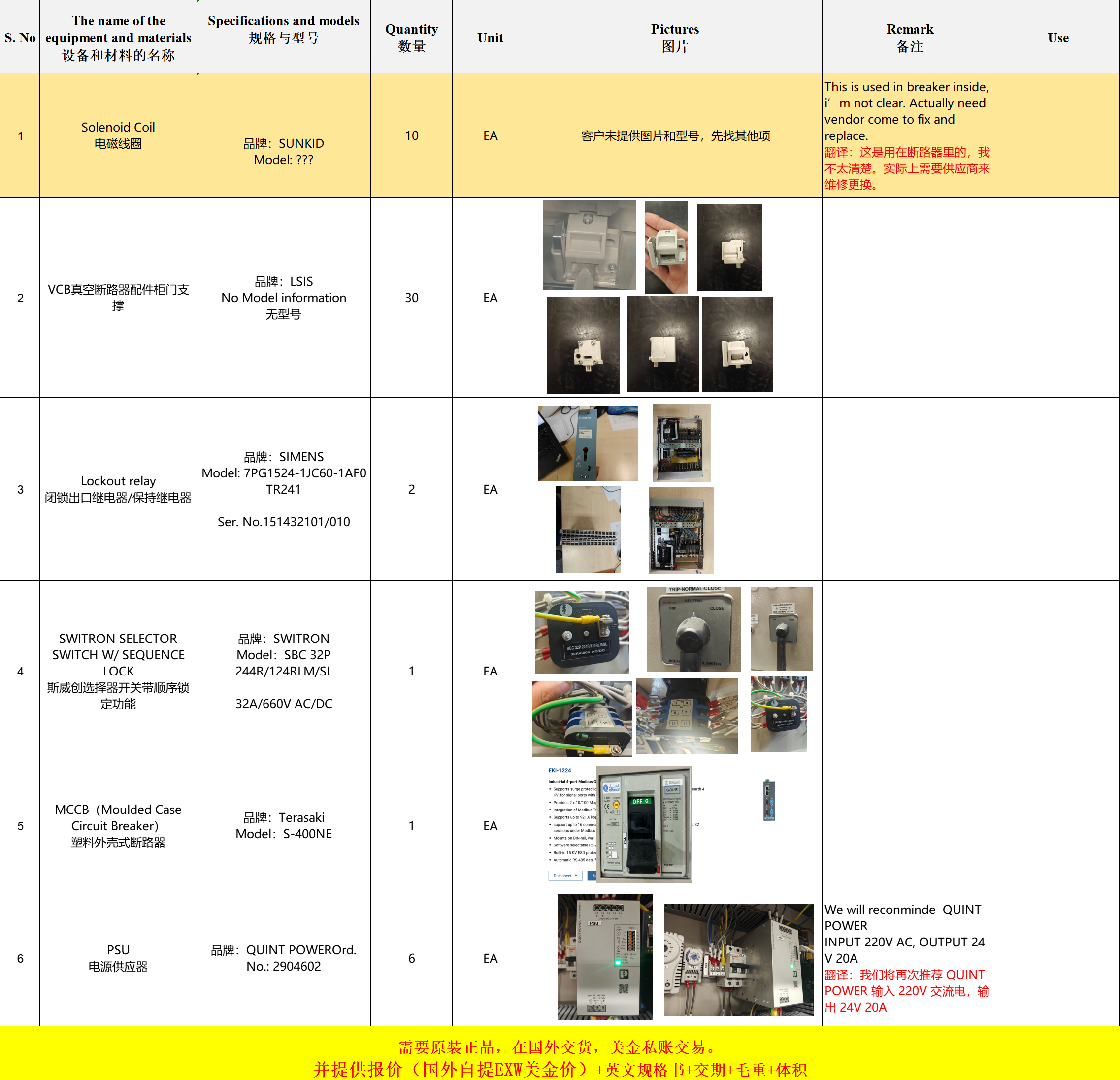 求购:6款进口件品牌电气配件