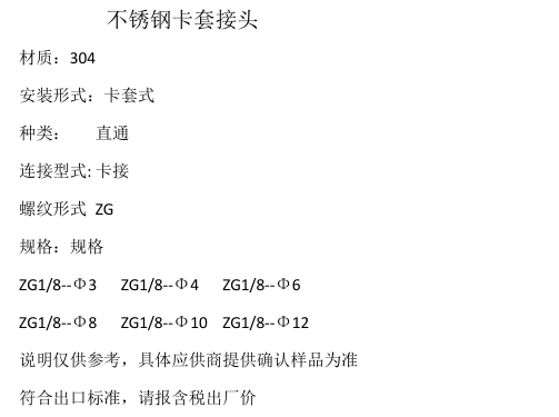 | 补充说明 | 材质:304 安装形式:卡套式 种类: 直通 连接型式: 卡接 螺纹形式 ZG 规格:规格 ZG1/8--Φ3 ZG1/8--Φ4 ZG1/8--Φ6 ZG1/8--Φ8 ZG1/8--Φ10 ZG1/8--Φ12 说明仅供参考,具体应供商提供确认样品为准 符合出口标准,请报含税 |